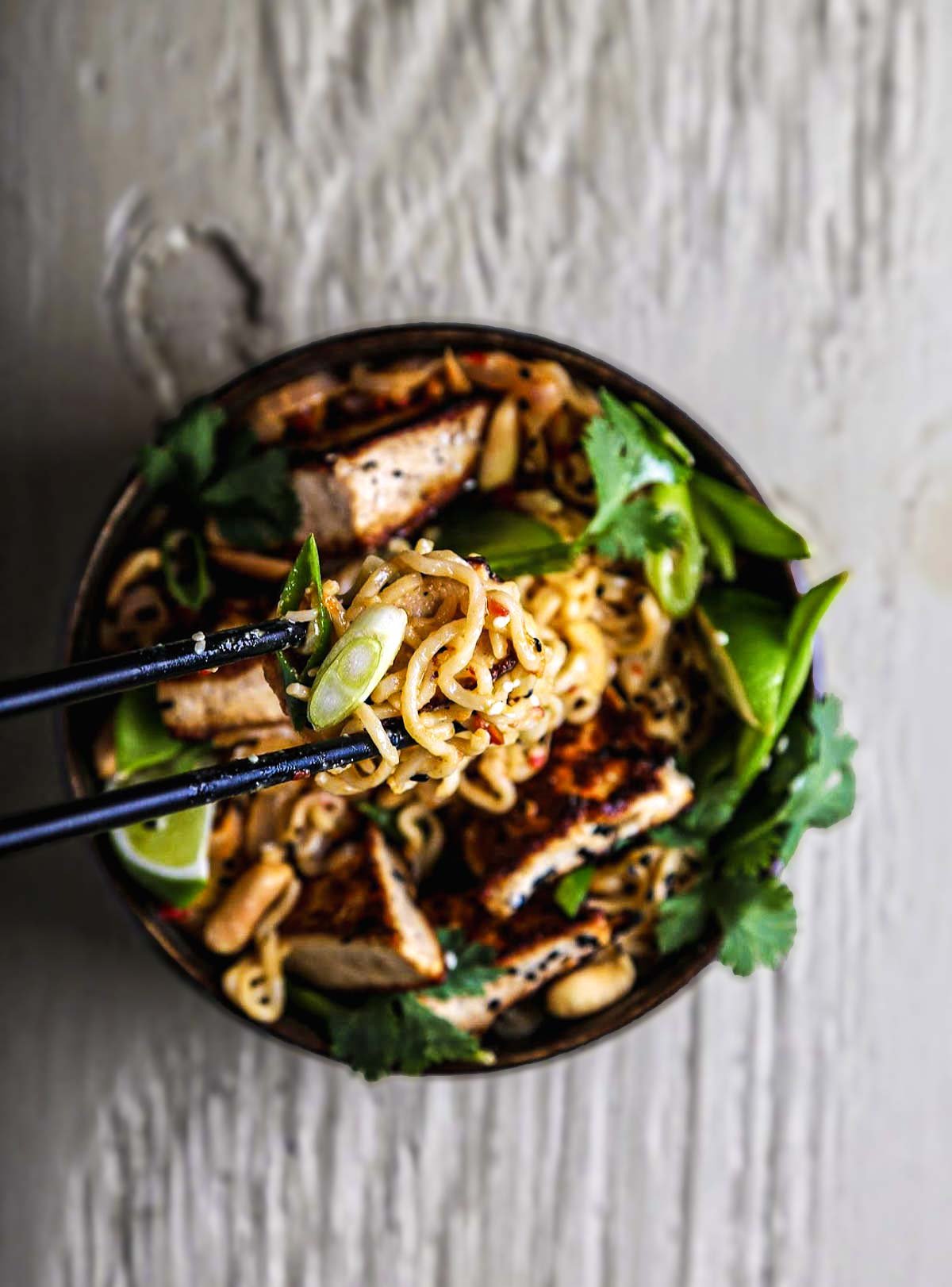 - Assemble the bowls: Toss the cooked noodles with the sauce until evenly coated. Divide between two bowls and top with the tofu.
