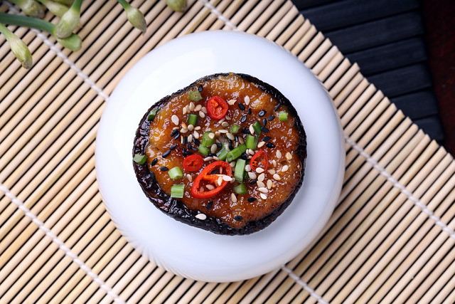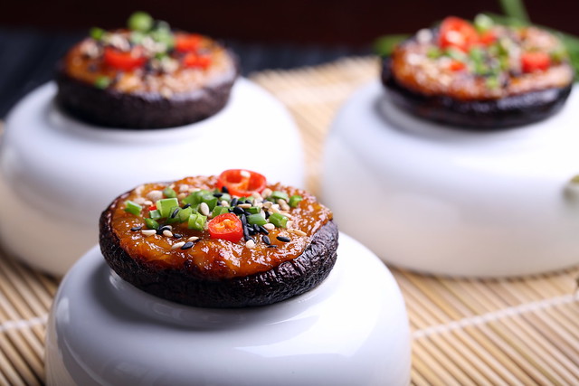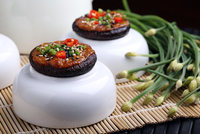 Here I’ve filled some shiitake caps with a blend of mellow miso and brown sugar to create a double dose of umami, then topped it off with some freshly sliced thai chilis and flowering chives to balance everything out and give them a little pop of color. This is a flavorful vegan recipe that’s simple to make yet offers bold and exciting flavor!