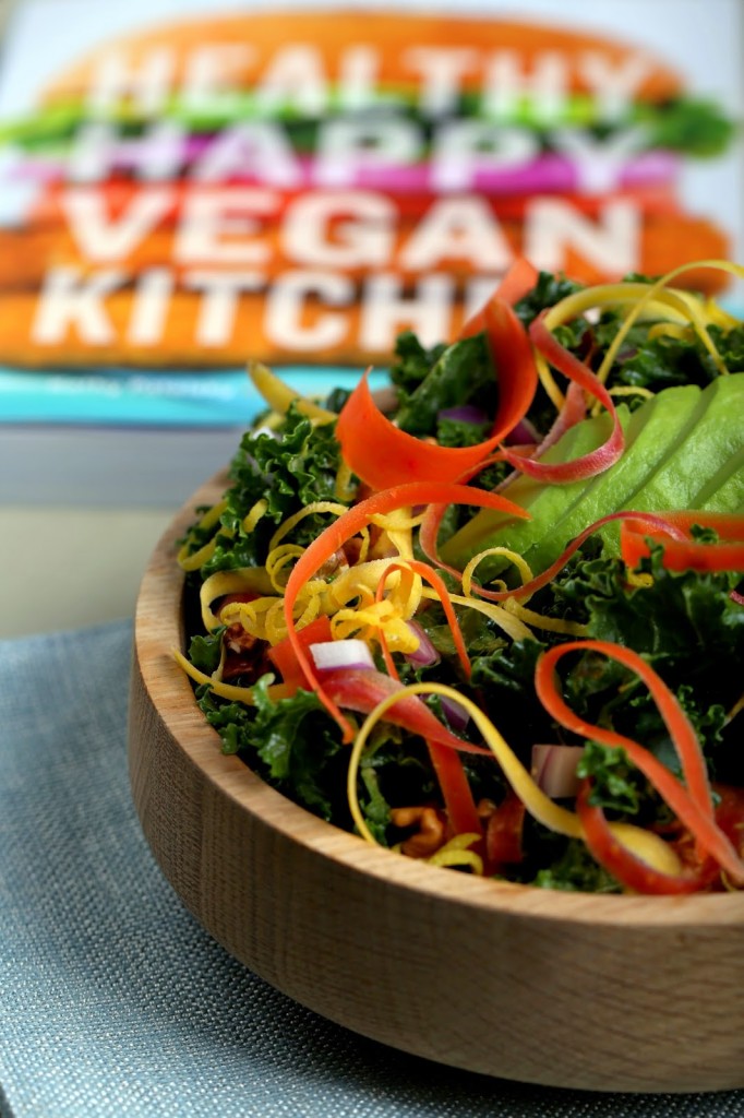 I first tried Kathy’s 5-Step Raw Kale Salad because it looked so colorful and bright, and I had almost all of the ingredients on hand already. You can never go wrong with tahini and kale, and Kathy kicks it up a notch by adding a touch of maple syrup and cayenne that brings everything together and keeps you going back for another bite. I’m super excited that Houghton Mifflin Harcourt has not only allowed me to share the recipe here, but is also offering a free copy of Healthy Happy Vegan Kitchen to one lucky reader through this post!
