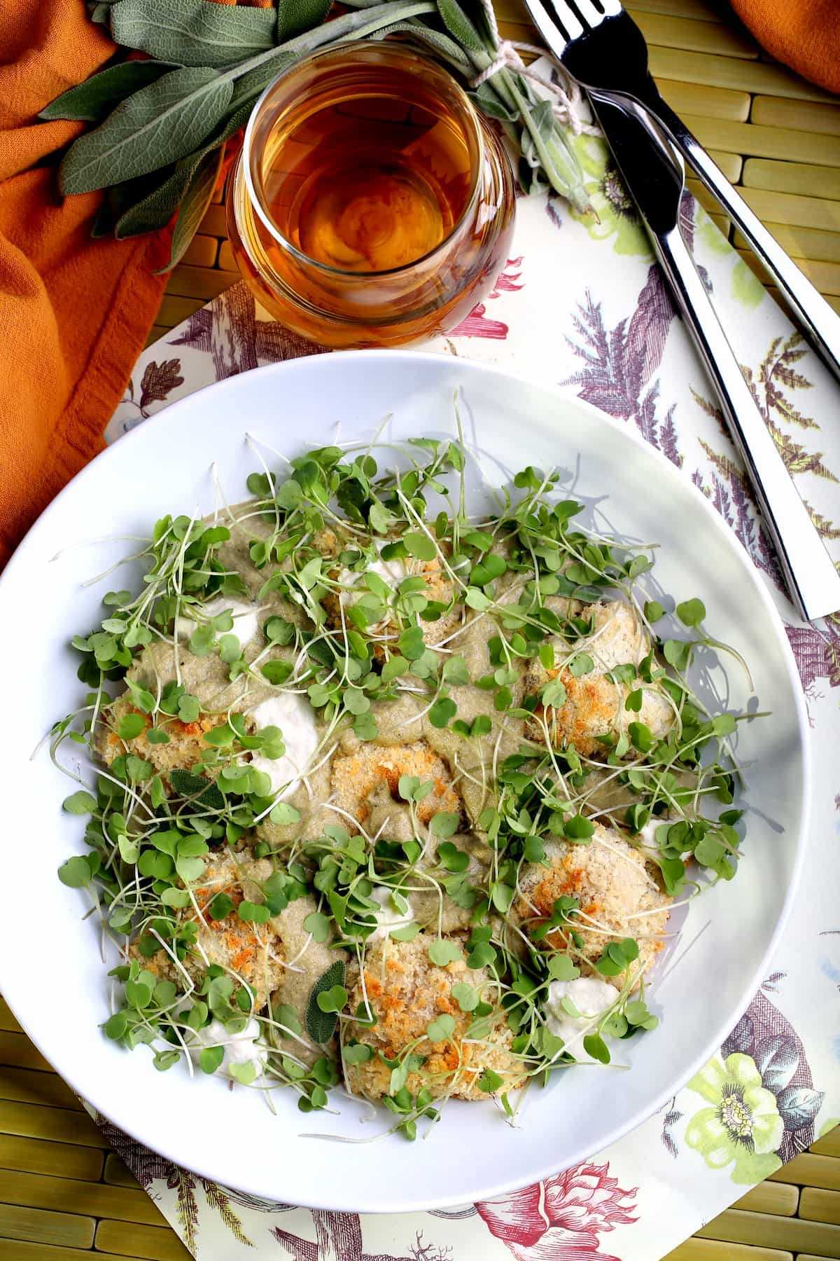 Regardless of what category this falls under, this dish is beautifully aromatic, bursting with Fall Harvest flavors like rubbed sage and pumpkin, complemented with walnuts, shallots and raw cashews to impart a rich note into the sauce. Breading and baking the ravioli is optional here, although it imparts a nice texture, elevating it from a simple ravioli dish into a decadent and hearty entree.