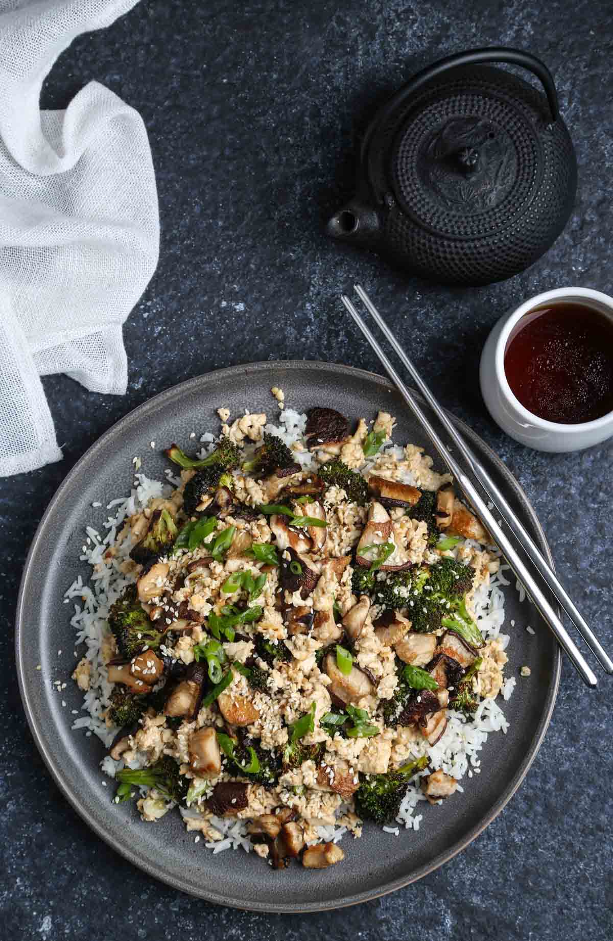 - Add rice to 2 plates. Add the tofu egg on top, then top with the roasted broccoli and vegetables.