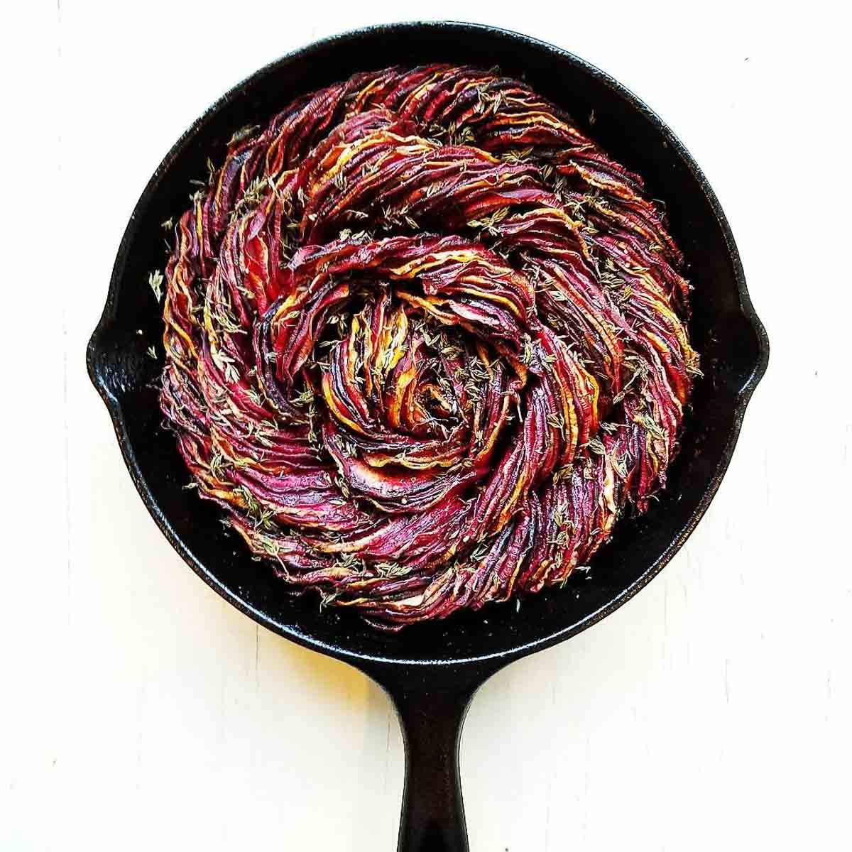 - Place alternating slices of beets in a straight line down the palm of your hand, about six at a time. Place them around the edge of the pan in a tight spiral. Keep spiraling towards the center until the pan is filled.