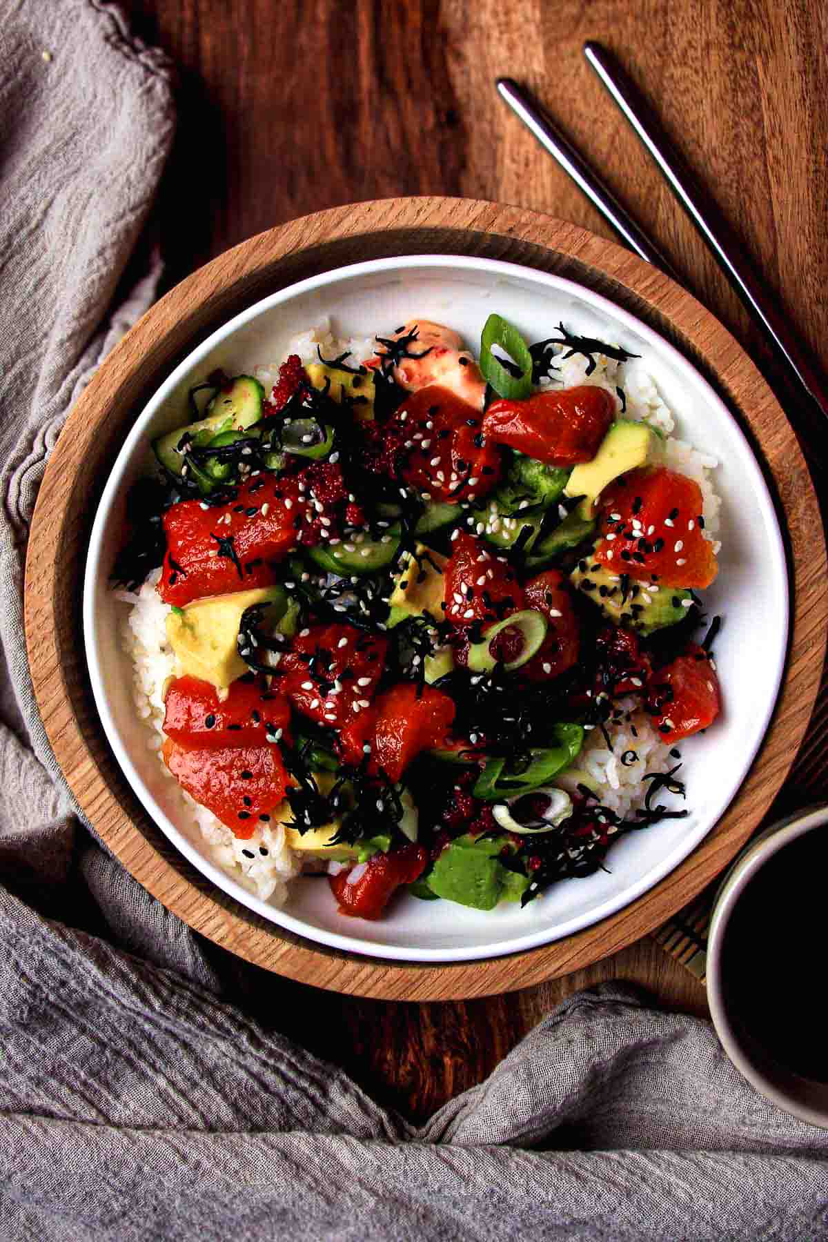 - Sushi Rice: Short-grain rice seasoned with vinegar, sugar, and salt forms the sticky, subtly sweet foundation. It’s warm, scoopable, and balances the chilled toppings beautifully—like any good poke bowl should.