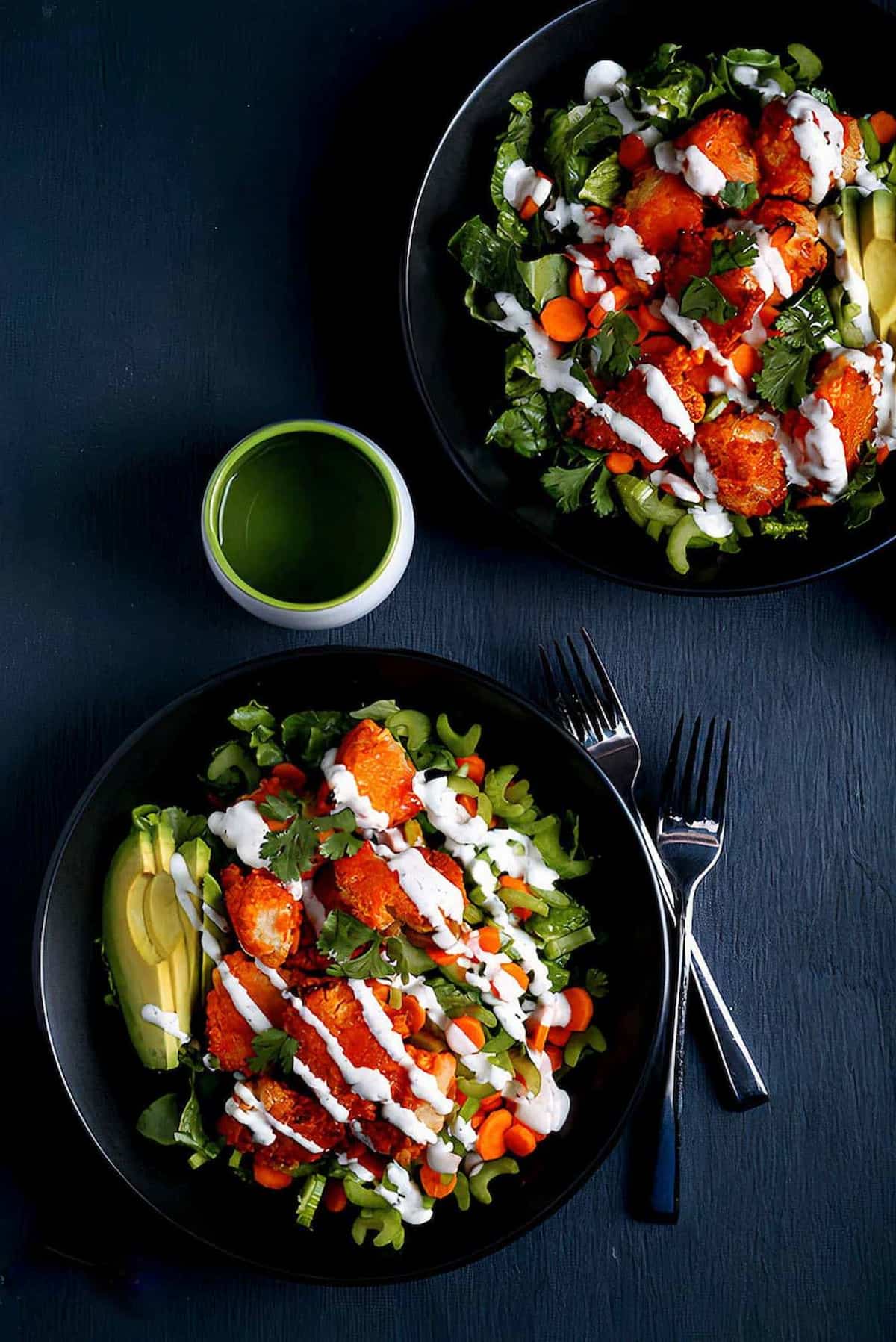 - Combine and Dress: Add the buffalo cauliflower bites on top of each salad. Drizzle with creamy vegan dressing and serve immediately. Enjoy!