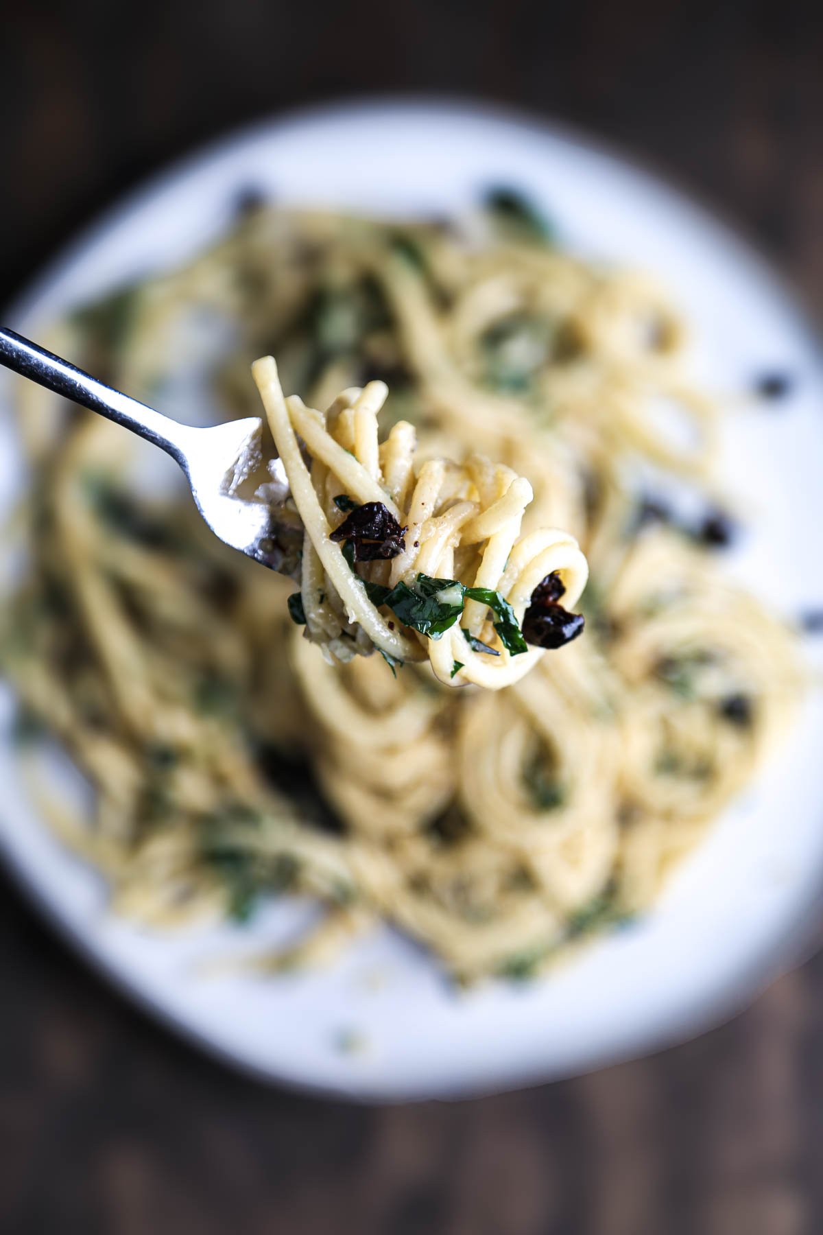 Sauté shallots and garlic in vegan butter until soft, then deglaze the pan with white wine and let it reduce. Add pasta water to help create a silky, emulsified sauce, then toss in cooked pasta until everything is coated. Finish with fresh parsley, briny olives, or a squeeze of lemon for extra brightness.