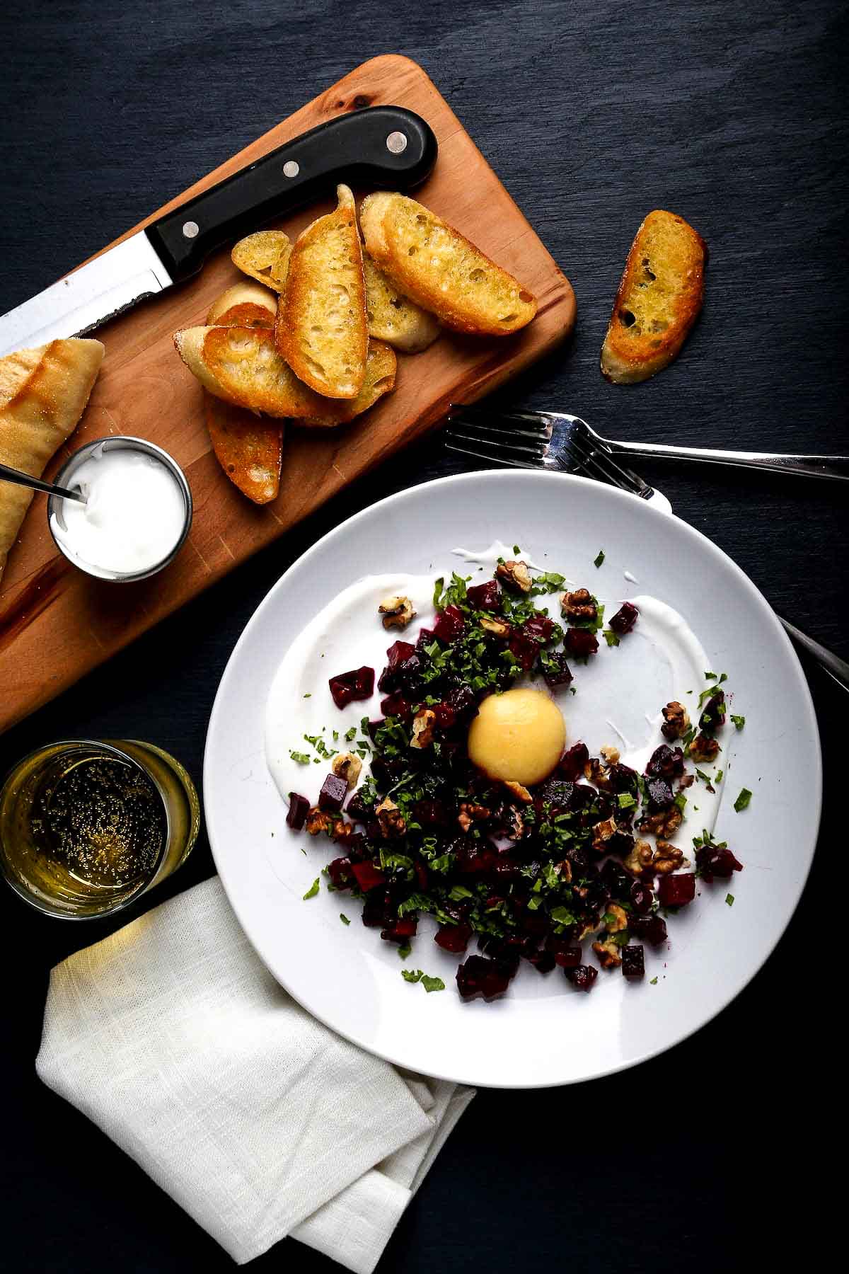 - Assemble the Dish: Swoosh some vegan sour cream onto a plate, add the beets, and sprinkle with toasted walnuts and minced kale, and crown with the mango yolks. Serve on toasted crostini for the perfect bite. Serve with a glass of wine or light beer. Enjoy!
