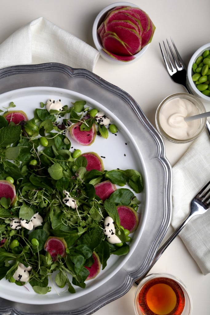 Anything super green and fresh is always appealing, like this mâche salad, with fresh mint, cold edamame, microgreens and paper-thin watermelon radishes with some sesame seeds thrown in for crunch. I love adding in this buttermilk-ponzu dressing, which adds a little fat and brightness, and is easy to whip up in minutes. There are all kinds of ponzu sauces available, but I love using a super-citrusy variety here, which works well with the richness of the “buttermilk” (vegan sour cream+coconut vinegar+a touch of unsweetened soymilk) and crispness of the greens.
