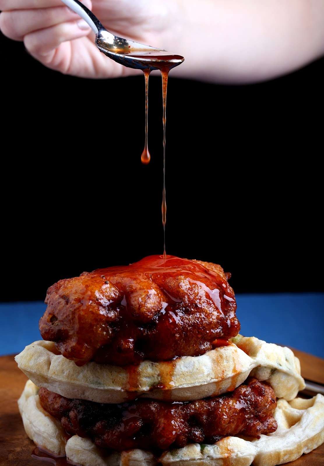 - Drag the chick’n through the sriracha-maple syrup until well coated. Serve the waffles with vegan butter and garnish as desired.