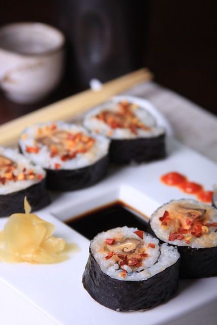 Dried shiitake mushrooms are lovely, and work incredibly well in sushi—their chewy and dense texture actually works better than fresh shiitake, and they hold up well to deep-frying. Adding some rich and spicy sriracha-Vegenaise sauce makes everything melt together here fabulously, producing a heavenly bite of sushi that’s also very easy to make.