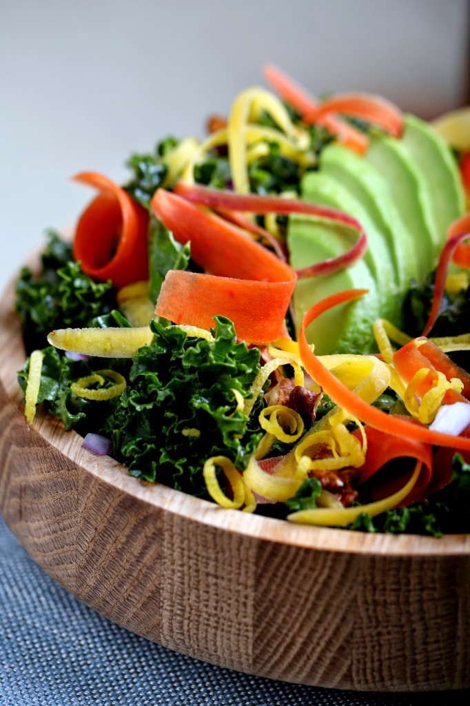 - Place the kale, carrots, avocado, and onion in a large bowl.