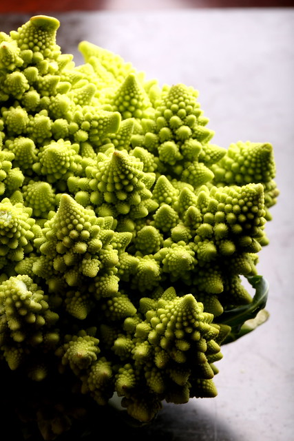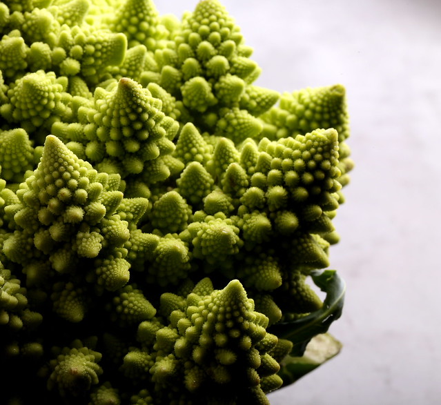 When I came across this beautiful romanesco at Whole Foods last week, I picked it up and kind of got lost in its pretty fractal patterns.