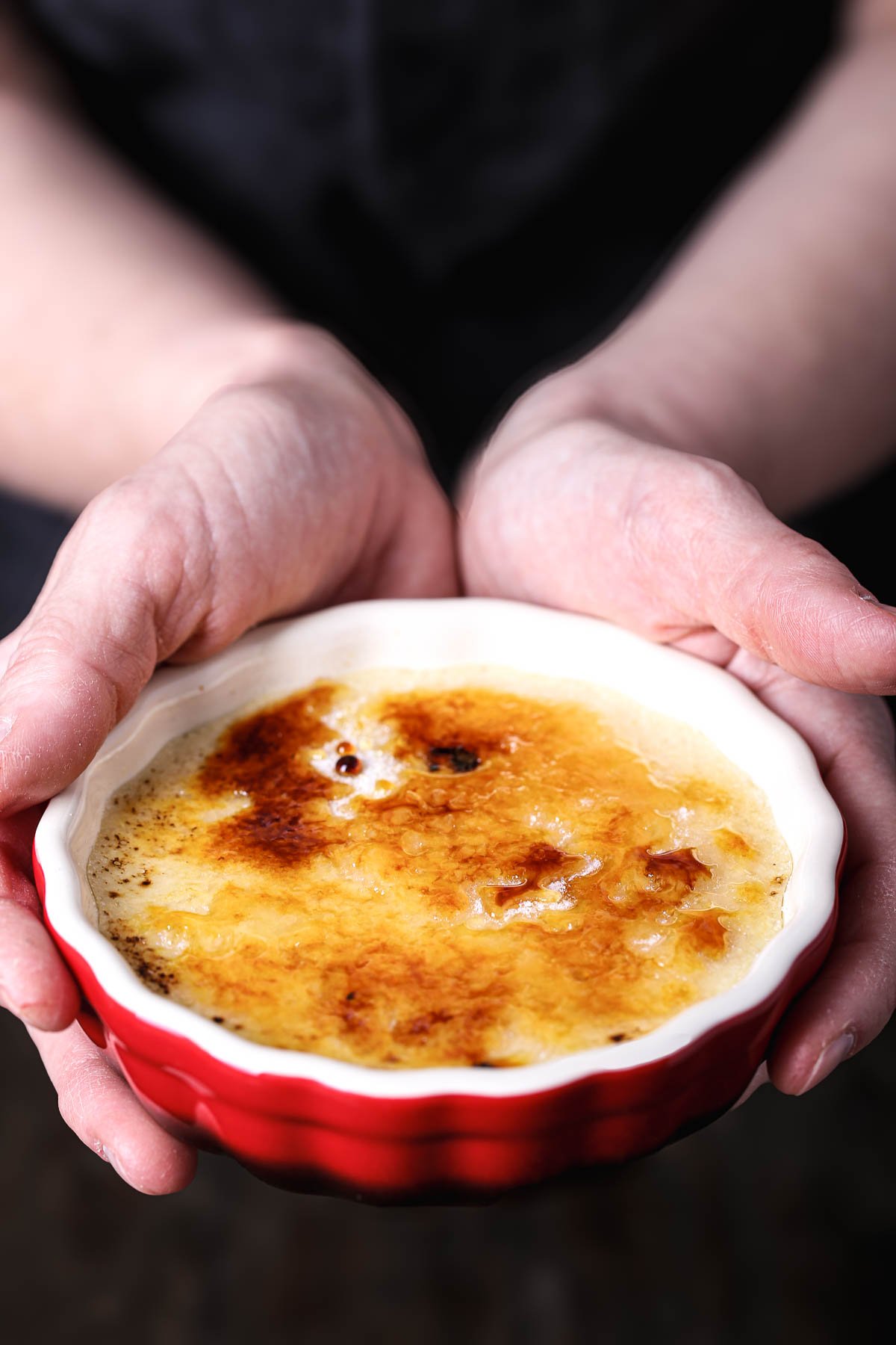 No torch? No problem. Place the ramekins on a baking sheet and pop them under a preheated broiler, keeping the door slightly ajar and watching carefully. Broil for 1–2 minutes, rotating the ramekins as needed for even caramelization. The sugar won’t get quite as glassy as a torch finish, but it’ll still melt into a golden, crackly layer. Keep an eye on them—the sugar can go from perfect to burnt in seconds. Dig in and enjoy immediately!