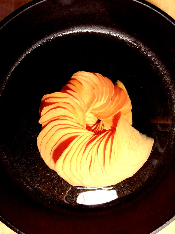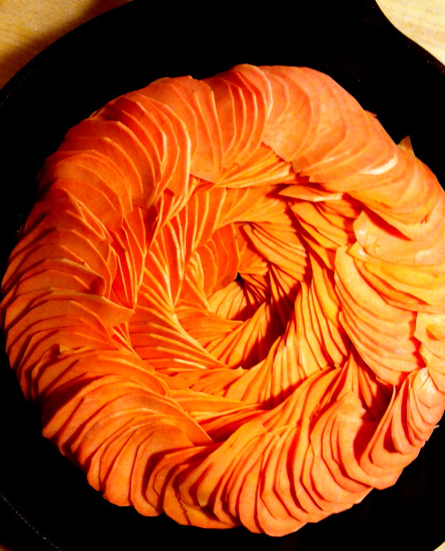 - Peel then slice the potato on a mandoline slicer*. Arrange the slices in a spiral pattern, starting in the center of the pan, and then building it outwards towards the edges.